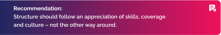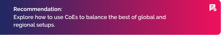 Overly centralized setups often showcase a lack of understanding around regional nuances. On the other hand, structures which are too siloed underestimate corporate learning and the economies of ‘best practice’. Of course, a popular halfway house is to run centres of excellence; i.e. business units which establish best practice and roll this out to the relevant regions and BUs. But this begs a question – how do you ensure your CoE is properly structured itself?